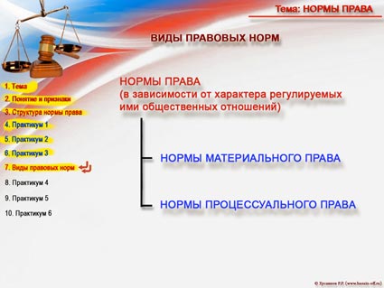 (На интерактивную доску выводится слайд №7 со схемой видов норм права в зависимости от характера регулируемых ими общественных отношений).