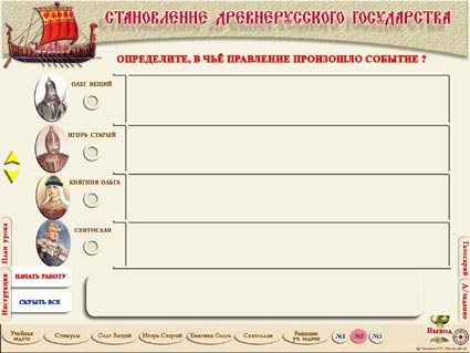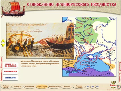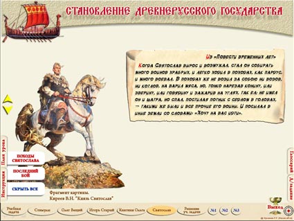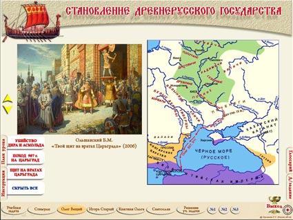 Интерактивная презентация к теме «Становление Древнерусского государства» (§ 5 учебника «История России. 6 класс. Учеб. для общеобразоват. организаций. В 2 ч. / [Н.М.Арсентьев, А.А.Данилов, П.С.Стефанович, А.Я.Токарева] : под ред. А.В.Торкунова. – М.: Просвещение, 2016») состоит из 14 слайдов, содержащих триггеры. Слайды «задание №1» и «задание №3» содержат улучшенный вариант макроса «MoveHim и MoveTo» для скачкообразного