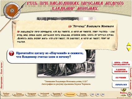 Интерактивная презентация к теме «Русь при наследниках Ярослава Мудрого. Владимир Мономах.» (§ 8 учебника «История России. 6 класс. Учеб. для общеобразоват. организаций. В 2 ч. / [Н.М.Арсентьев, А.А.Данилов, П.С.Стефанович, А.Я.Токарева] : под ред. А.В.Торкунова. – М.: Просвещение, 2016») состоит из 14 слайдов, содержащих триггеры. Слайд «задание №1» содержит улучшенный вариант макроса «MoveHim и MoveTo» для скачкообразного перемещения объектов в режиме демонстрации презентации (макрос предложил David M.Marcovitz, оптимизировал А.Н.Комаровский).