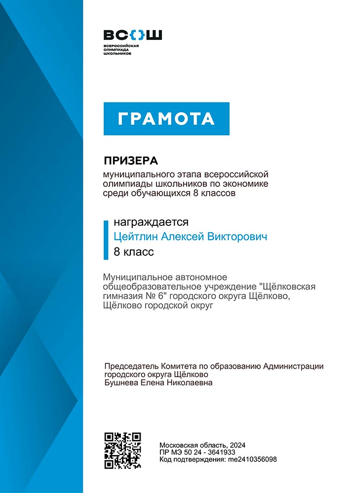 Цейтлин Алексей Викторович, обучающийся 8 класса, Призёр муниципального этапа Всероссийской олимпиады школьников по экономике (ПР МЭ 50 24-3641933. Код подтверждения: me24103560998 Дата проведения 05.11.2024).