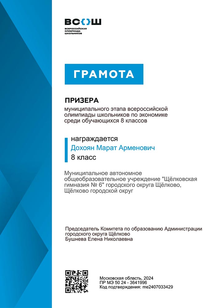 Дохоян Марат Арменович, обучающийся 8 класса, Призёр муниципального этапа Всероссийской олимпиады школьников по экономике (ПР МЭ 50 24-3641996. Код подтверждения: me2407033429 Дата проведения 05.11.2024).