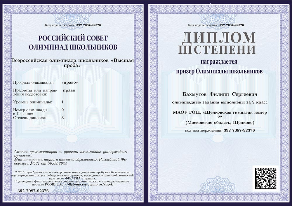 Диплом III степени Призёра всероссийской олимпиады школьников «Высшая проба» по праву «Награждается Бахмутов Филипп Сергеевич, ученик 11 класса «МАОУ Щёлковская гимназия №6» ГОЩ» (дата проведения: 14.02.2025). (Олимпиада входит в «Перечень олимпиад школьников и их уровней на 2024/25 учебный год» (Приказ Минобрнауки России от 30.08.2024 №571, п.9, Уровень олимпиады: 1)